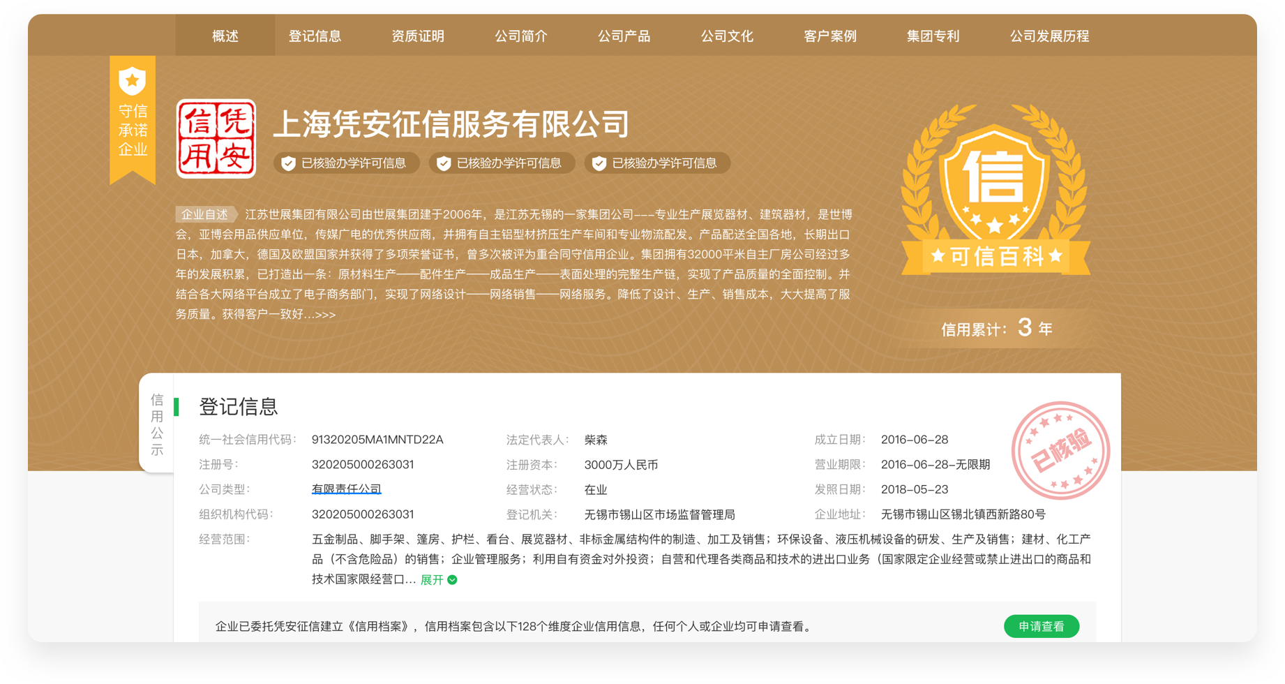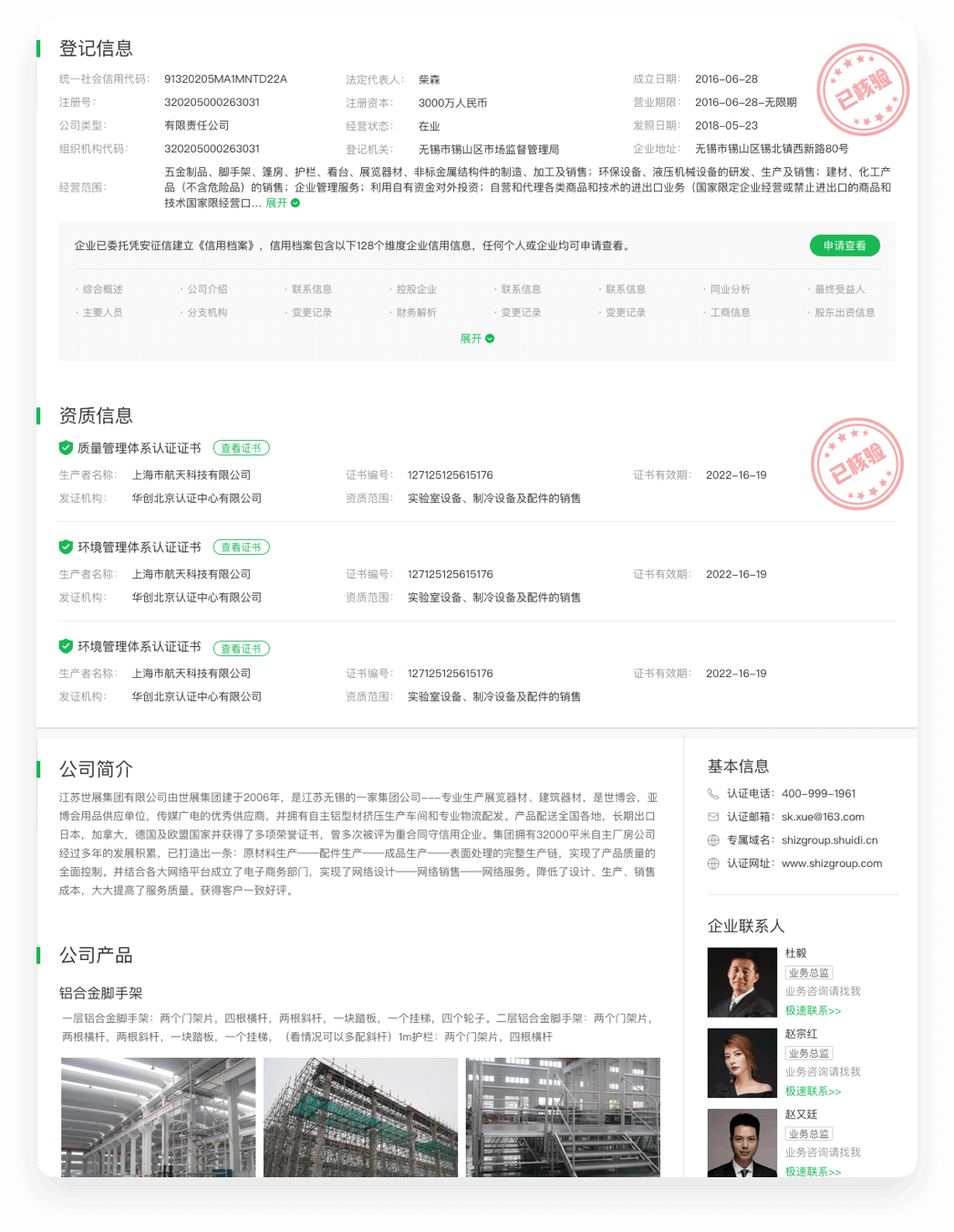 企业可信百科根据企业不同的需求,展示不同的名片样式,百科名片头部为官方核验信息, 为潜在合作者营造权威可信感;下方为企业自述板块,企业可以自主编辑企业信息, 全方位展示企业特点,促进交易达成。